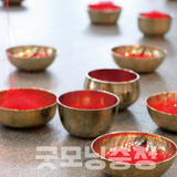 윤희수, 바치다, 2025, 가변 설치, 놋그릇, 붉은 실, 구들돌