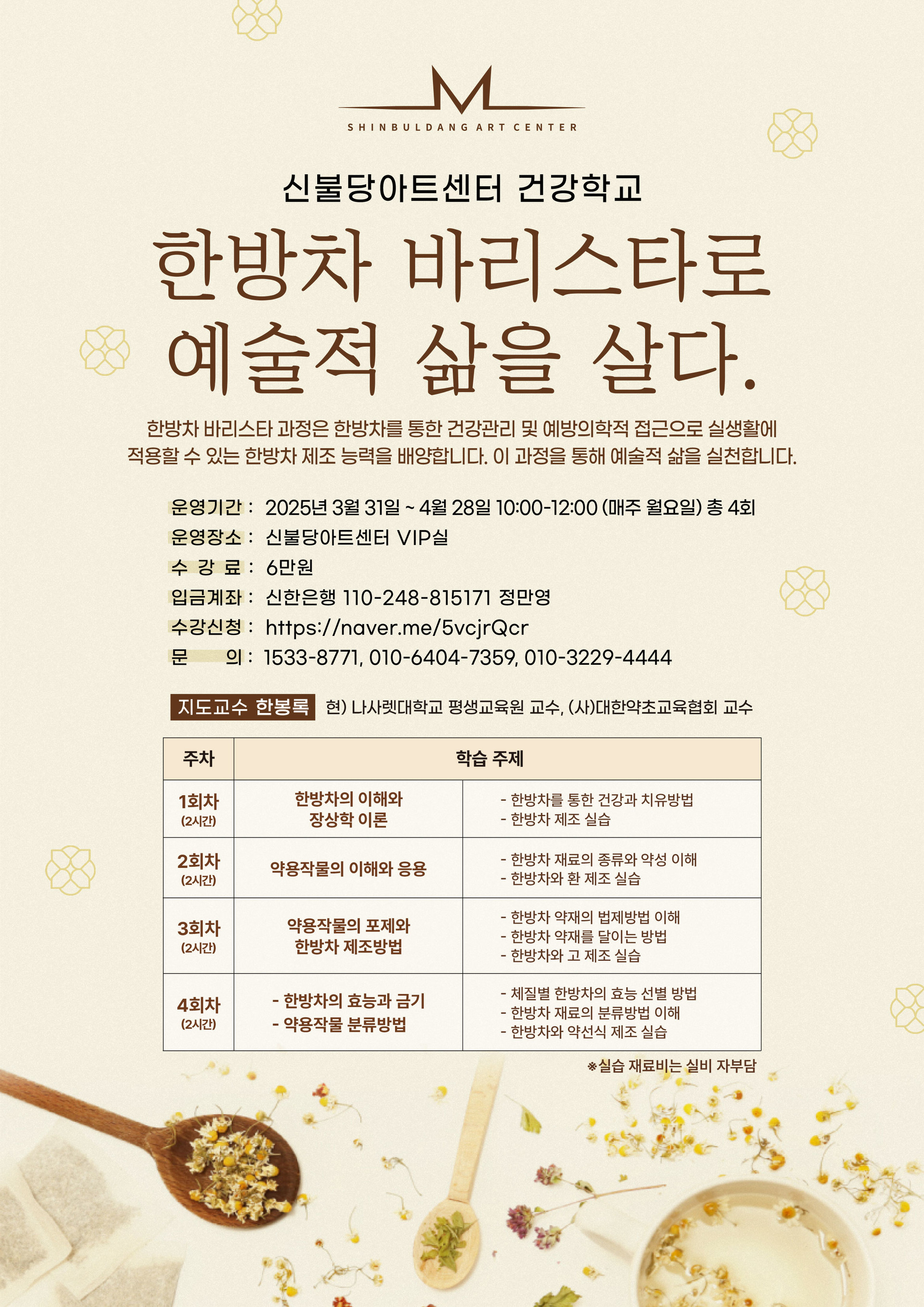 행사명 한방차 바리스타로 예술적 삶을 살다.행사 일시 2025.03.31. ~ 2025.04.28.