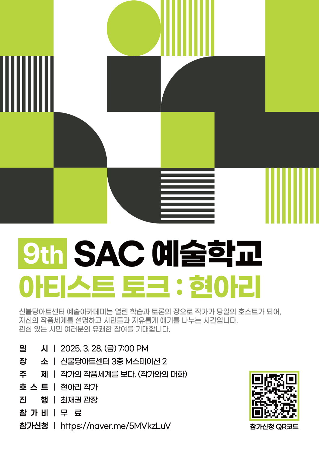 행사명 9th 예술학교 아티스트 토크 : 현아리행사 일시 2025.03.28.(금) pm. 07:00